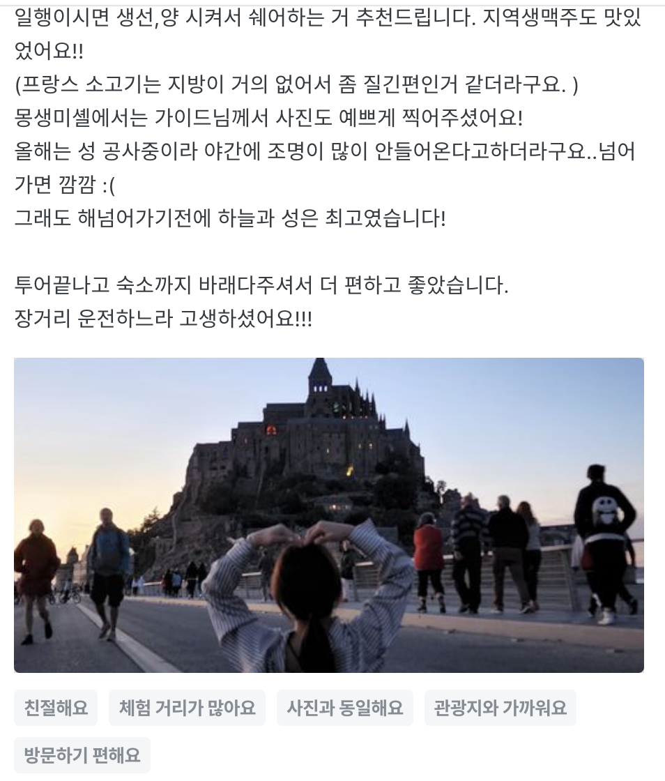 몽생미셸에서도 차에서 내려서 걸어 이동하는 일정이라 갈아입은 상태로 가시는게 일정 소화하기 좋습니다.
