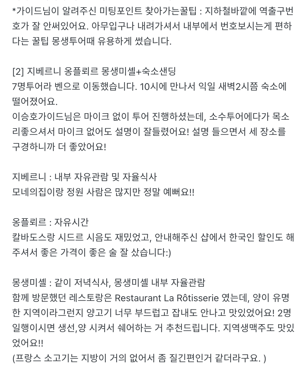 2022년 8월 초에 지베르니+옹플뢰르+몽생미셸 투어를 즐겼는데, 지베르니, 옹플뢰르, 몽생미셸 3 도시를 방문했어요. 투어스케줄은 월이나 사정에 따라 일정이 변동되는 듯하니 예약 하실 때의 공지를 꼭 확인해주세요. 저는 친구랑 둘이 갔는데, 딱 좋았어요! 다른분들도 전부 2-3명일행으로 오셨었어요.